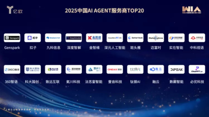 在此行业背景下,作为本届WIM创新者年会的核心重磅成果,《2025中国AIAgent服务商TOP20》榜单的发布便具备了极强的行业价值。该榜单的评选由亿欧智库联合行业权威专家开展,评选维度全面覆盖技术研发实力、商业化落地能力、行业服务口碑、生态适配性、未来发展潜力等核心指标,经过多轮严格评审最终确定入选名单。